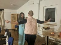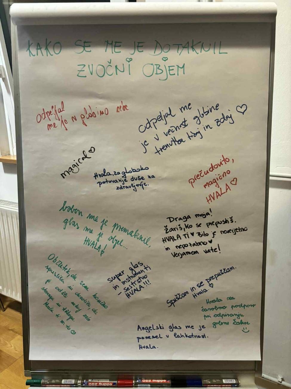 Sama sem imela še en dodaten razlog za hvaležnost, ki jo besede težko izrazijo. Povabljena sem bila, da ves ta proces podprem še z zvokom. Pripravila sem nam večer, kjer je vsaka lahko začutila moč svojega notranjega in na ven slišnega glasu. Zgodila se je takšna harmonija, da se mi ob pisanju teh vrstic ponovno nabirajo solze v očeh od ganjenosti in čarobnosti, ki se je zgodila. Proces je bil intenziven, za vsako na svoj način, vsaka je prejela skozi zvok in moje petje tisto, kar je njena duša potrebovala v danem trenutku.